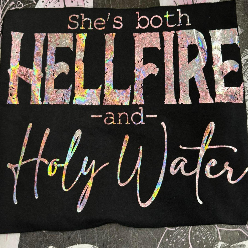 Shes Both Hellfire and Holy Water Holographic Shirt Apparel Womens Clothing - Unisex Fit - Screen Print Holographic C-65 - Pink Heart Silver Halo