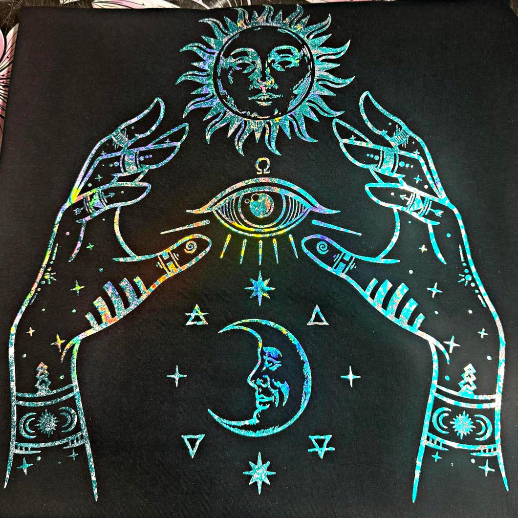 Gypsy Hands Third Eye Shirt - Color Shifting Holographic Print- MAIN COLORS ARE BLUE AND SILVER